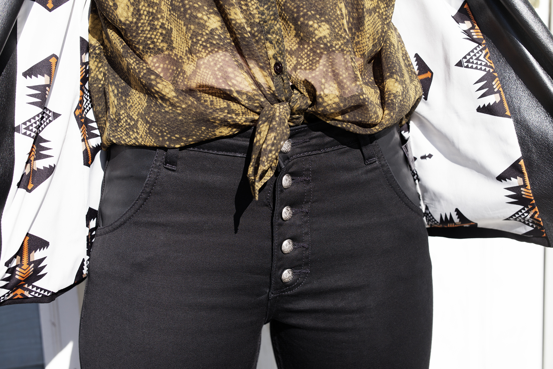 Well, one of the most exciting things about being in a band has been getting to meet people in the fashion world. I’ve never been a big designer person. I’ve never been a big label person. For me, clothing is personal – a reflection of who you are. I’ve never seen it as something that’s about status or privilege. I want to feel comfortable in my clothes, and I want to feel beautiful and confident. I like the idea of working with designers who do it because they love it. So when I was put in touch with Lisa [Fuller] from Courtshop I could see that. She has this small company that’s New York-based, and she’s just this badass chick who is just in love with making jeans. The fact that I could sit down with Lisa and talk to her about her label…that she’s been to our shows…that relationship is so exciting for me. And the jeans she makes are great! They’re generally pretty high waisted, which I find is more flattering on me. These that I’m wearing are called the Audrey. What I love about Courtshop jeans is that they are always sort of basic and classic, but then Lisa adds these little details like the leather pockets and the buttons. I love leather and I love denim-and-leather mixes, and that can be hard to do in a way that’s classy.