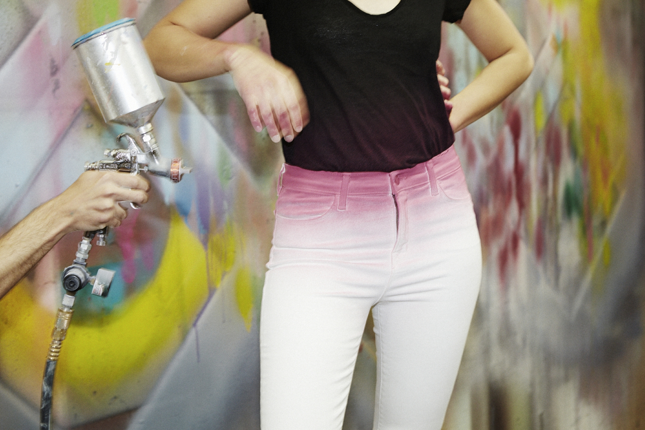 The custom pair Rob painted for us on his studio assistant Aliyana Gewirtzman (J Brand’s Maria high-rise) reminded him of the tropics. “A tequila sunrise cocktail,” he called the combination of pink, yellow, and tangerine after he finished circling with the spray gun. Of course, what a woman has that a canvas does not are curves. “When the model stands in these tight jeans all of these wrinkles and creases and folds occur,” Rob explained pointing to the places around Aliyana’s hips and knees that revealed themselves to be bright white when she shifted her weight after the first application of paint. Rob likened these striations to chips in a marble sculpture – fresh, without weathering – and preferred not to paint over them. ” It just makes it even sexier in terms of defining the form,” he said.