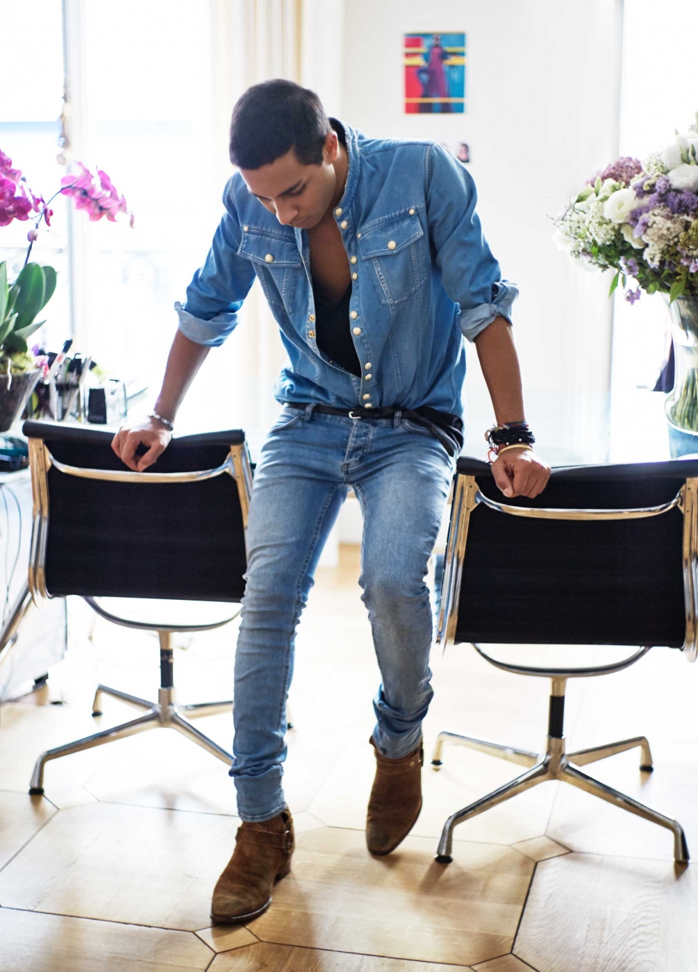 I love mixing different colors of denim together, I really love that. The jeans I’m wearing I’ve had for maybe three years, and my denim shirt is actually from the womenswear collection, but in a bigger size for me, and it’s from two years ago.
