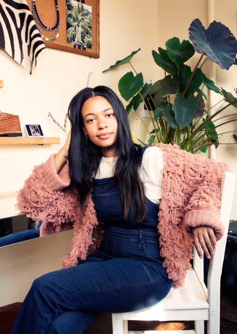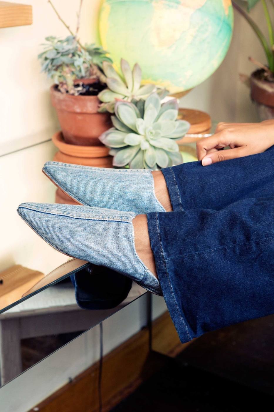 It was via Instagram that I discovered designer Aurora James, who not only has the most covetable denim sandals and slides in her shoe line, Brother Vellies, but also loves indigo so much she had her couch custom upholstered in a patchwork of traditional African indigo textiles. Entering the Brooklyn apartment-slash-studio she shares with her photographer boyfriend Jason Hardwick recently, I knew all about the Vellies – from following @brothervellies, mostly – but the latter (that couch!) was a total surprise. As were the chic Frame overalls that Aurora wore for our shoot with a fuzzy pink sweater by Ryan Roche and a pair of her own denim babouches (Moroccan slippers)…as was the giant wall stocked with really cool footwear in back, too (see below). I didn’t just swoon, I started shopping.