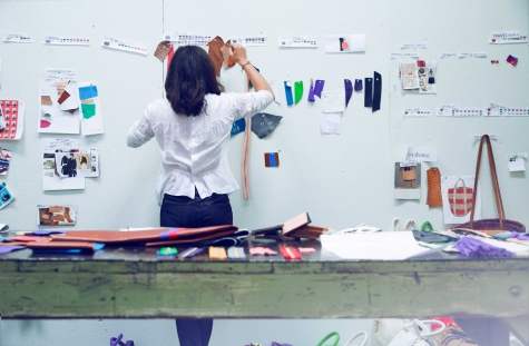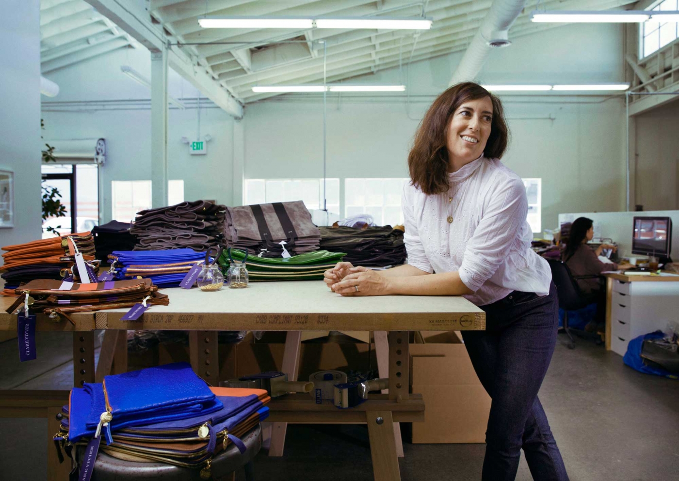 Three words come to mind when we think of handbag designer Clare Vivier’s leather clutches and carryalls: classic, clean, and (brilliantly) unfussy. Neither pouch nor tote is ever too embellished or tricky. So, you can imagine our excitement when we spotted her new collection of denim accessories – a mini-duffel, a chevron-printed envelope, a roll-up backgammon set, to start – while visiting Clare’s Silver Lake studio on our last trip to L.A. She was wearing denim espadrilles in a blue that matched her Acne matchstick jeans to a T. Her striped button-down shirt was crisp and casual. And her team of effortlessly dressed young women was wearing jeans of every kind, from white and high waisted to borrowed from a boy (literally). We swooned and took a seat to talk to Clare about what she wants from a pair of jeans now vs. how she wore them in her 20s, and why denim makes such good sense for handbags.