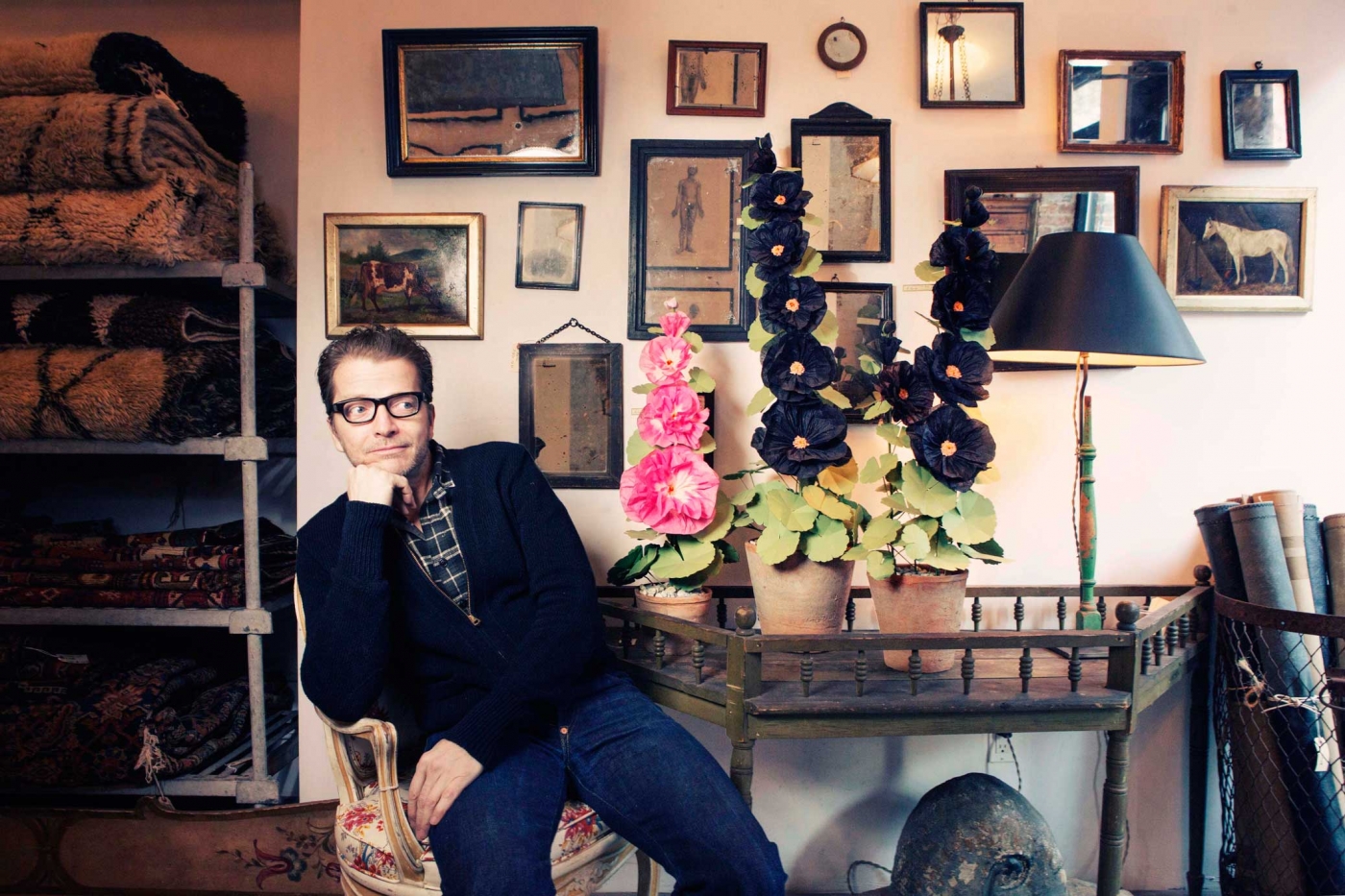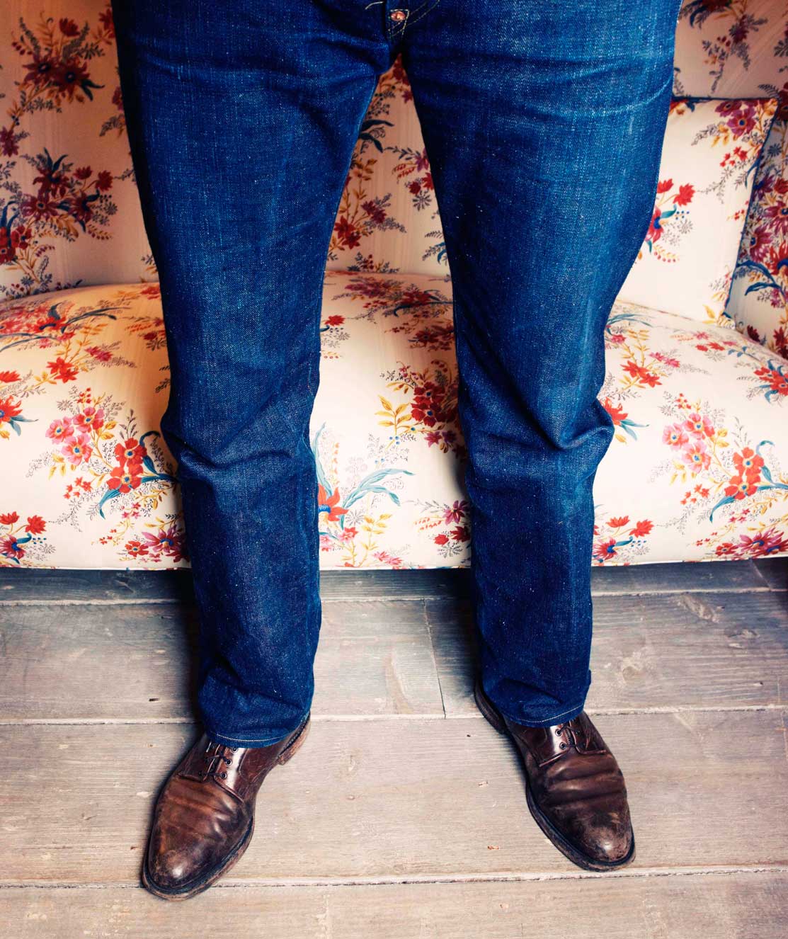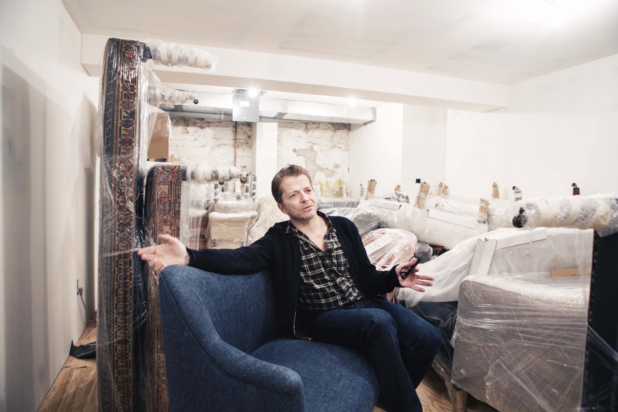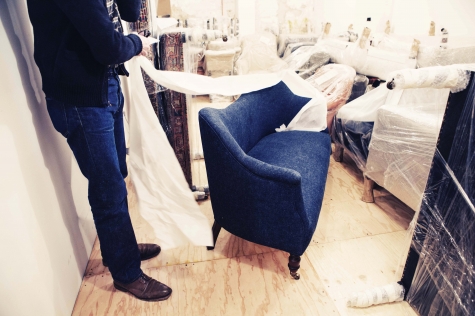 “I just think it’s going be incredible when it wears,” says John Derian as he removes the wrapping from a brand-new loveseat upholstered in indigo-dyed denim. “It’ll be so obvious, just like a pair of jeans, or like leather when it patinas.” The denim – made of 55% hemp and 45 % cotton – is one of five new fabrics that Derian is introducing into his furniture line, which is now housed in its own shop in between his decoupage-filled flagship and Dry Goods stores on East 2nd Street in New York City. Covering the loveseat, a formal two-seater with a back shaped like a top lip, the casual, blue jean fabric looks phenomenal. “It’s all washed,” Derian says taking a seat (fear not, his beautiful sofa won’t stain its sitters). “We can really do anything in the store in this fabric, but I think this piece is the most popular.”