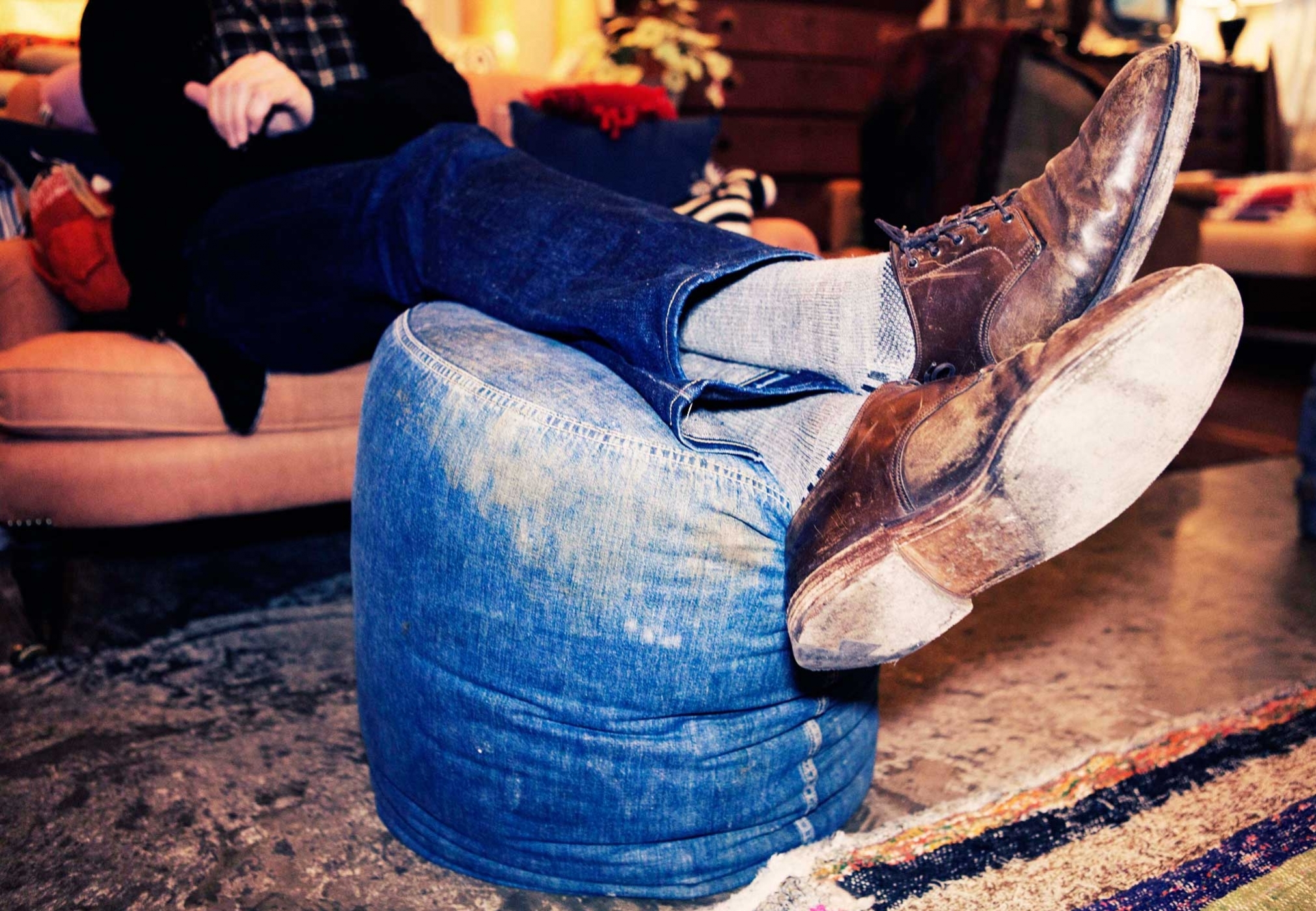 Though part of the furniture collection, which Derian does in collaboration with Cisco Brothers, the loveseat is actually destined to be displayed next door on Dry Goods grounds, in the company of other gorgeous indigo things: sarongs and striped blankets from West Africa; one-of-a-kind pillows flip-sided with an exquisite floral fabric from Tissus Tartares; a pouf made of a vintage laundry sack. “It’s the thing that maybe goes with everything in your home,” says Derian of denim. “As a chair, as a sofa, it doesn’t ever look out of place. Mix it with anything from John Robshaw, and it looks great.”