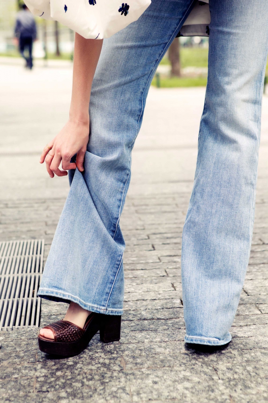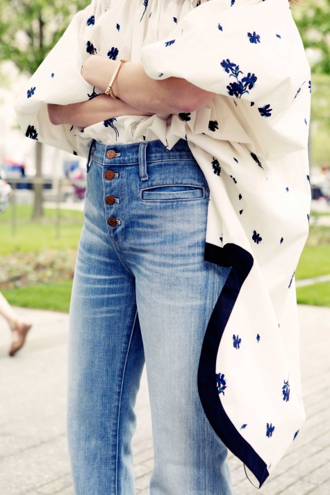 Kudos to Becky Malinsky, Glamour magazine’s senior fashion market editor, for thinking to turn her new Rachel Comey dress into a top by tucking the front of it into a high-rise flare. It’s exactly this – her having not just an eye for great pieces, but also the ability to see their full potential – that makes Becky one of the best in our biz. Her favorite jeans right now: a bell bottom from Madewell called the Flea Market, which has an exposed button fly – “very of the moment,” she says – and a groovy blue wash that she loves because “it looks worn, but it’s not overly whiskered.” Personally, if I was a superhero from the 70s, I’d dress my character just like Becky, in jeans that hide a pair of easy-to-run-in platform shoes and give a girl the power of extra-long legs. WHA-POW!