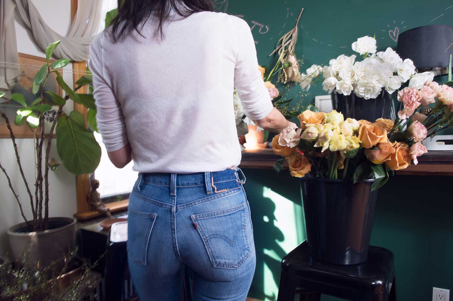 At the couple’s home in Greenpoint, Brooklyn, one gets the clear sense that Lisa and Jonathon live with their work. Her flowers spill into into the kitchen. His instruments – tambourines, banjo, guitars – hang on the living room walls. Almost better than having Jonathon’s new new LP, ‘Dark Was the Yearling,’ play on vinyl in the background during our shoot, was having Jonathon pick at his the banjo while Lisa made an arrangement close by. There’s a song on Jonathon’s album called ‘Hearts Racing,’ and I highly recommend you click here and listen; it’s the perfect soundtrack to this story.
