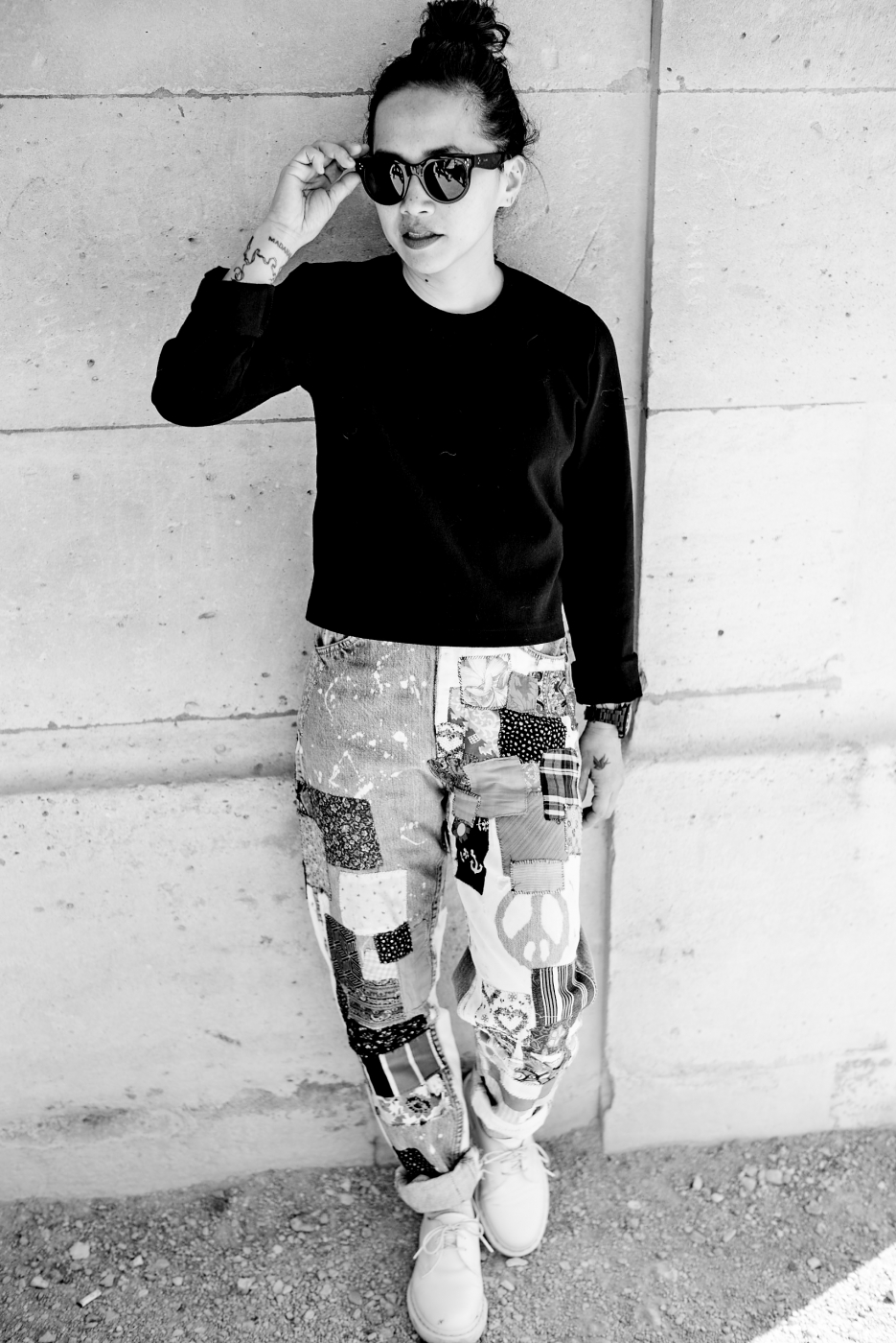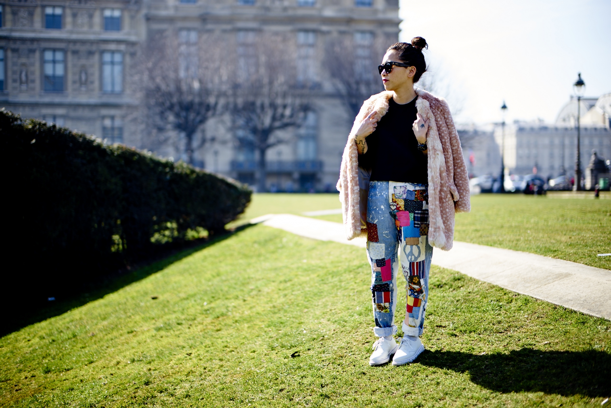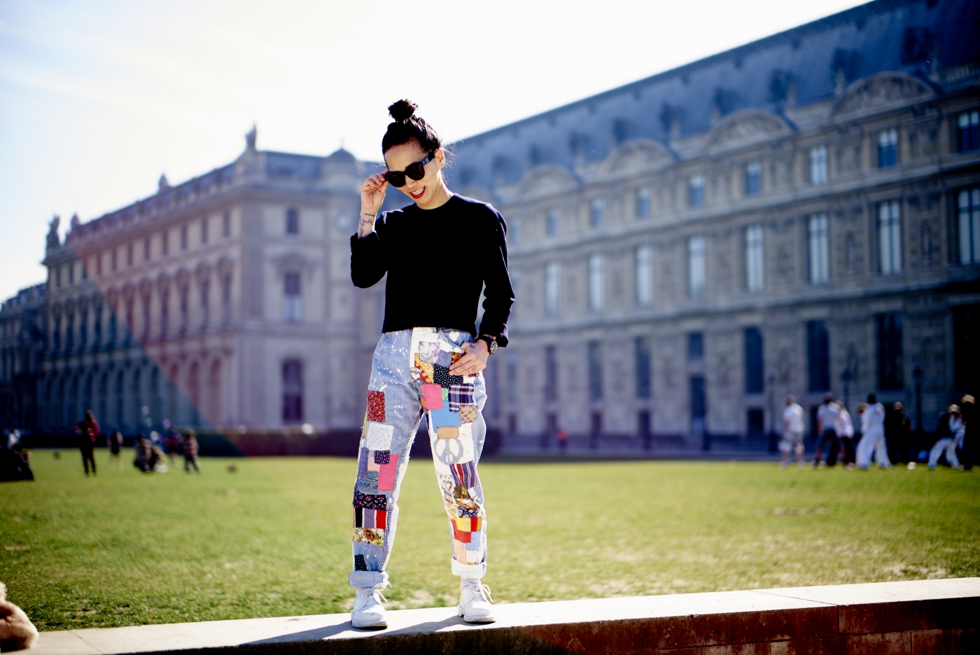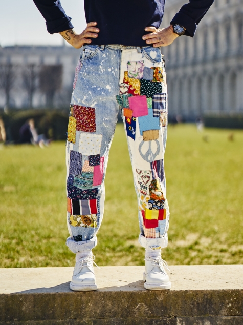 But wait, can I tell you how glorious it was in Paris the day we photographed Olivia in the Tuileries? Sunshine, karate class and dogs off their leashes on the lawn… “How fun was that?!?,” she wrote me later. Pretty darn fun. As fun as Olivia and her jeans. These Lees are clearly a labor of someone’s love, and that’s what Olivia connects to most in them. “Seriously, every patch, every bleach mark, every stitch was purposeful, hand-done, and intentional,” she said. “I like to wonder who the person who did this was – what did she eat for breakfast, did she have a dog, what color is her hair?” And, I might ask, what would she think if she saw her jeans on Olivia, having a heck of a time on a Sunday afternoon in the City of Light? Wish you were here!
