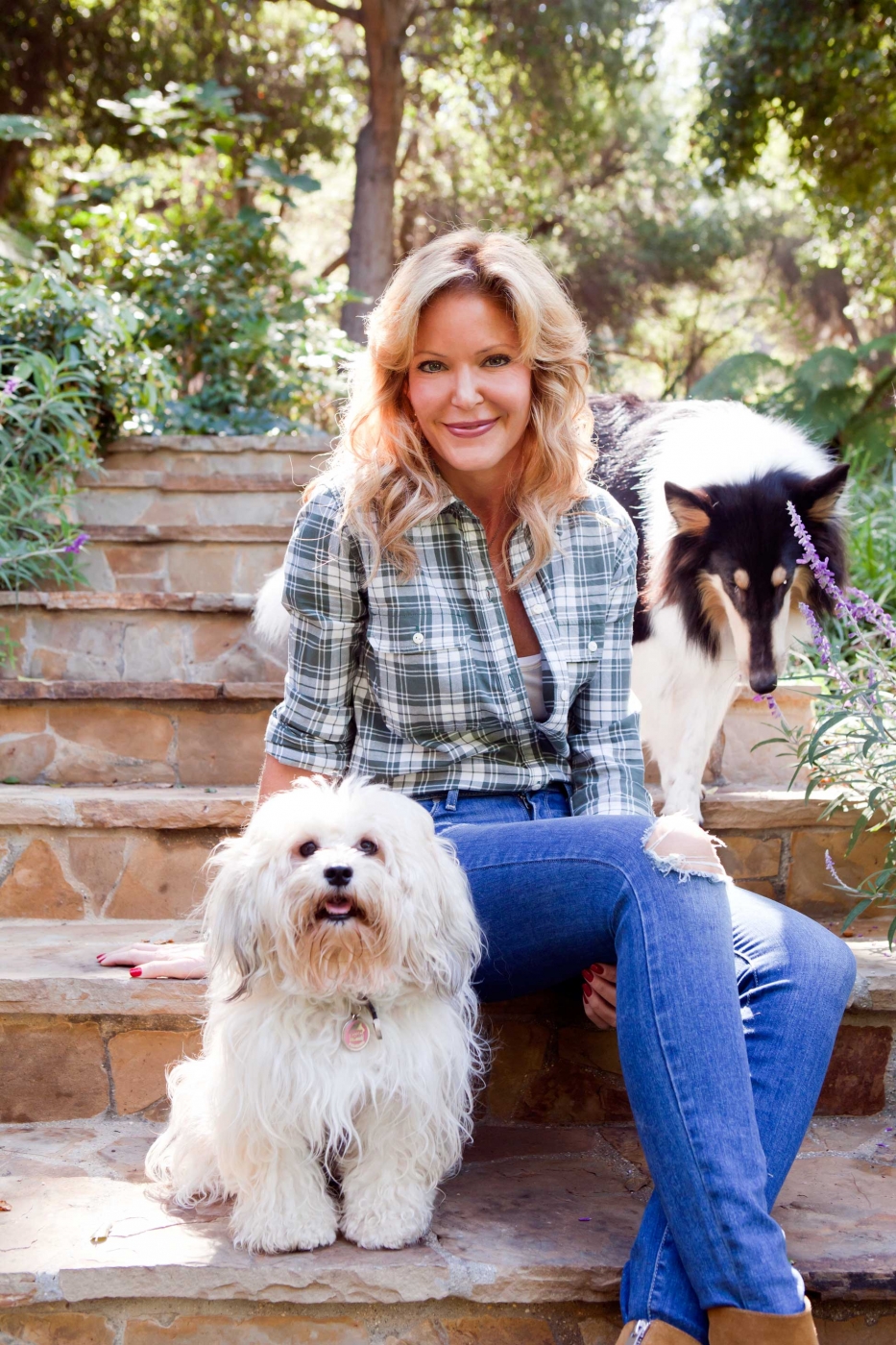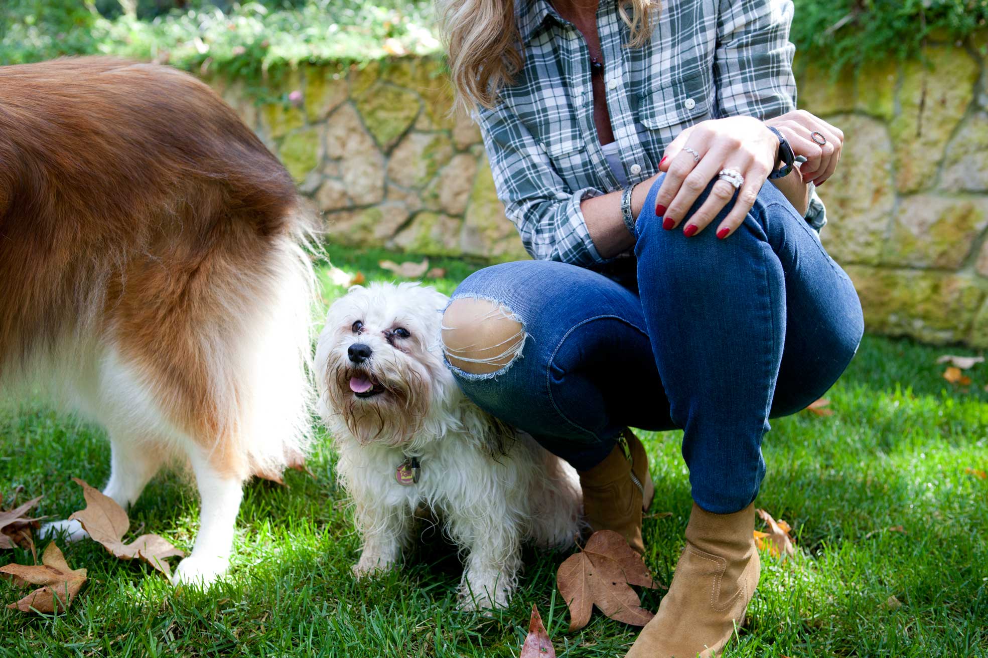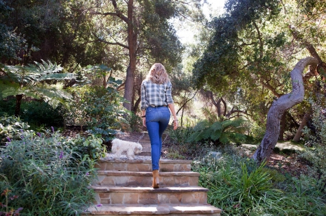 For our shoot, Paige wore her famous Verdugo Ultra Skinny, a signature style, in a tear-and-repair wash from the line’s new heritage-inspired Legacy collection. “It looks vintage, but the fabrication has modern fit technology,” Paige said of Legacy while playing in her backyard with London, her Multipoo, and Chelsea, her Lassie-look-alike Collie. Speaking of London, it’s Paige’s favorite city, and the inspiration for much of her fall collection, specifically the galaxy coated blue metallic jeans that she designed after dying her hair red and channeling her inner David Bowie. “It was so fun!” she said of being a redhead for a year.