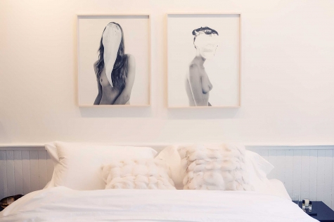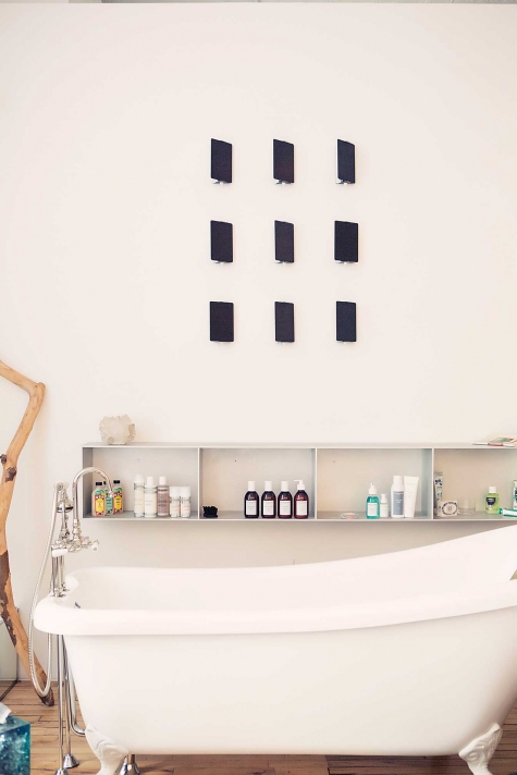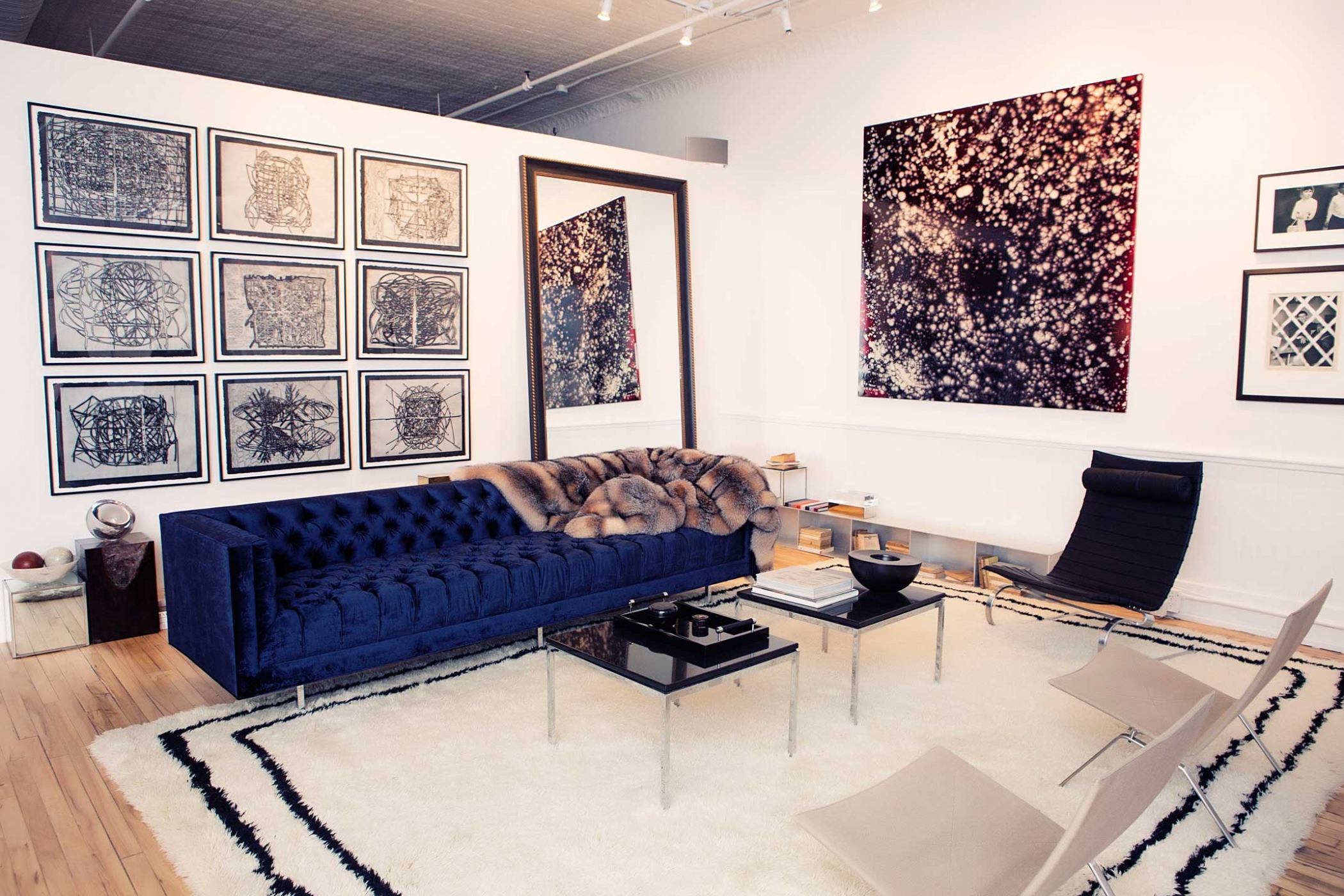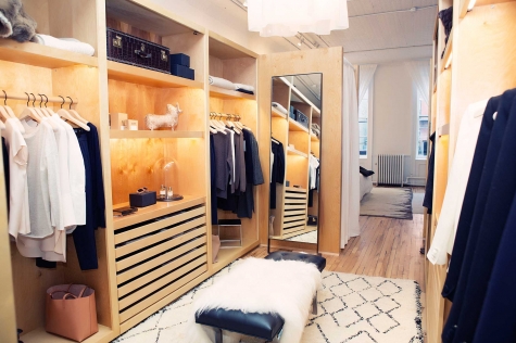 Our interview with Vanessa Traina, Morgan Wendelborn, and Kate Wendelborn (the two are sisters) took place on a bed – possibly the most comfortable bed ever – in the “bedroom” of Vanessa (above left) and Morgan’s (above center) new Manhattan showroom, The Apartment, where everything you see, from the Las Venus midnight-blue tufted velvet sofa in the “living room,” to the “bathroom’s” Sachajuan and Rodin products, to the Mansur Gavriel bags in the chic “closet” (not to mention that dreamy bed and bedding!) is available for purchase. It goes hand-in-hand with The Line, their e-commerce site; You can visit The Apartment to see in person the fashion, home, and beauty items found on The Line.com.